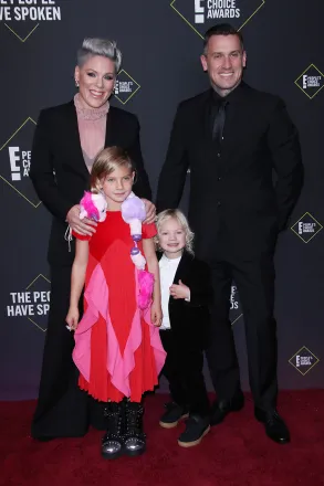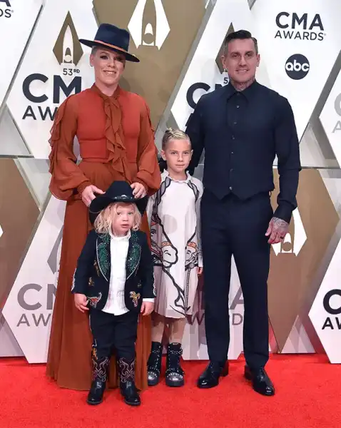 Pink has been accompanied by her husband Carey Hart for close to two decades. The pair are smiling alongside their children, Willow and Jameson, at the 2019 People’s Choice Awards (Matt Baron/Shutterstock)
