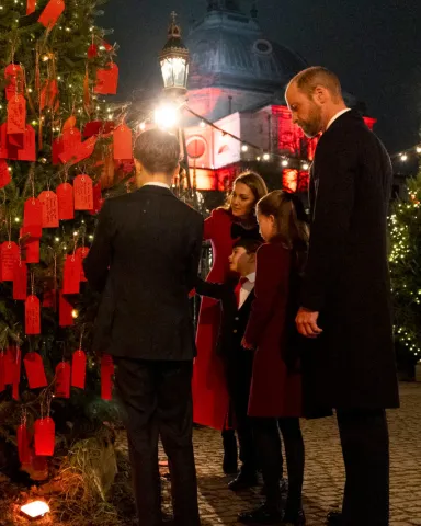 LONDON, ENGLAND – DECEMBER 06: The Prince and Princess of Wales with their children Prince George, Princess Charlotte and Prince Louis look at messages on the Kindness Tree ahead of the Together At Christmas carol service at Westminster Abbey on December 6, 2024 in London, England. The Prince and Princess of Wales, along with other members of the Royal Family, attended the annual carol service. Led by The Princess and supported by The Royal Foundation, the event offered a chance to pause and reflect on the profound values of love, compassion, and the vital connections we share—particularly during life's most challenging moments. The service also highlighted remarkable individuals from across the UK who have demonstrated extraordinary kindness, empathy, and support within their communities. (Photo by Jordan Pettitt – WPA Pool/Getty Images)