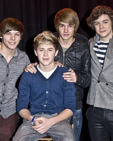 Talk Talk Secret Gig – London.Four of the five members of One Direction, left to right: Louis Tomlinson, Niall Horan (seated) Liam Payne and Harry Styles at a secret X factor gig, sponsored by Talk Talk, at the Hospital in London. Picture date: Wednesday December 01, 2010. Photo credit should read: Ian West/PA Wire URN:9859858 (Press Association via AP Images)