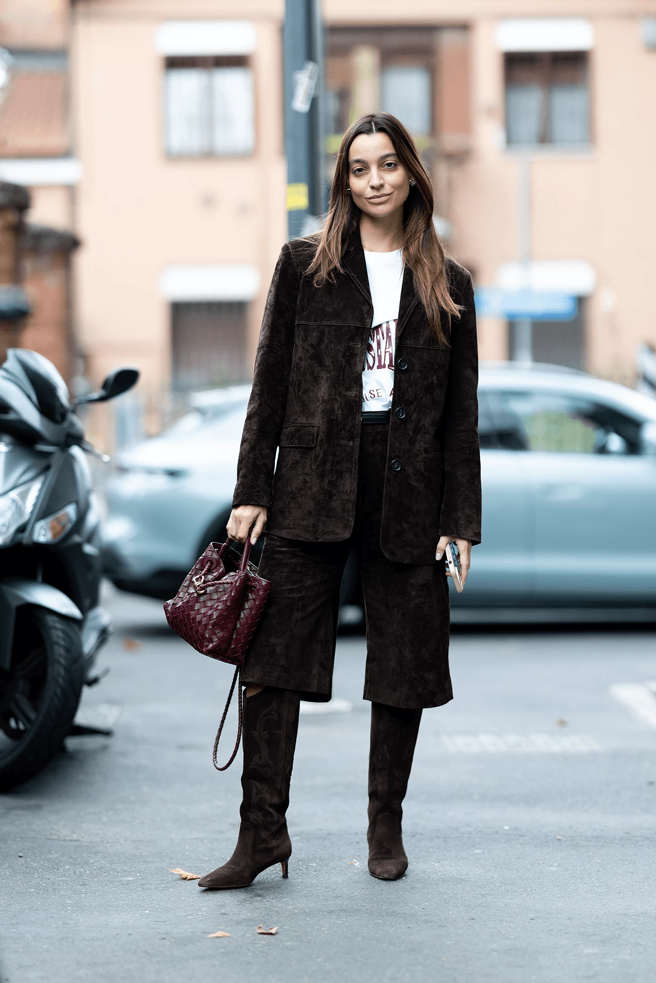 To emphasize the flexibility of the shorts, they come in suede, a superb material for the autumn months, yet retain a timeless essence. Match them with pointed cowboy boots and delicate heels in a matching tone to visibly extend your legs. Include a coordinating jacket, and the ensemble is ideal for a luncheon with friends or an evening meal.