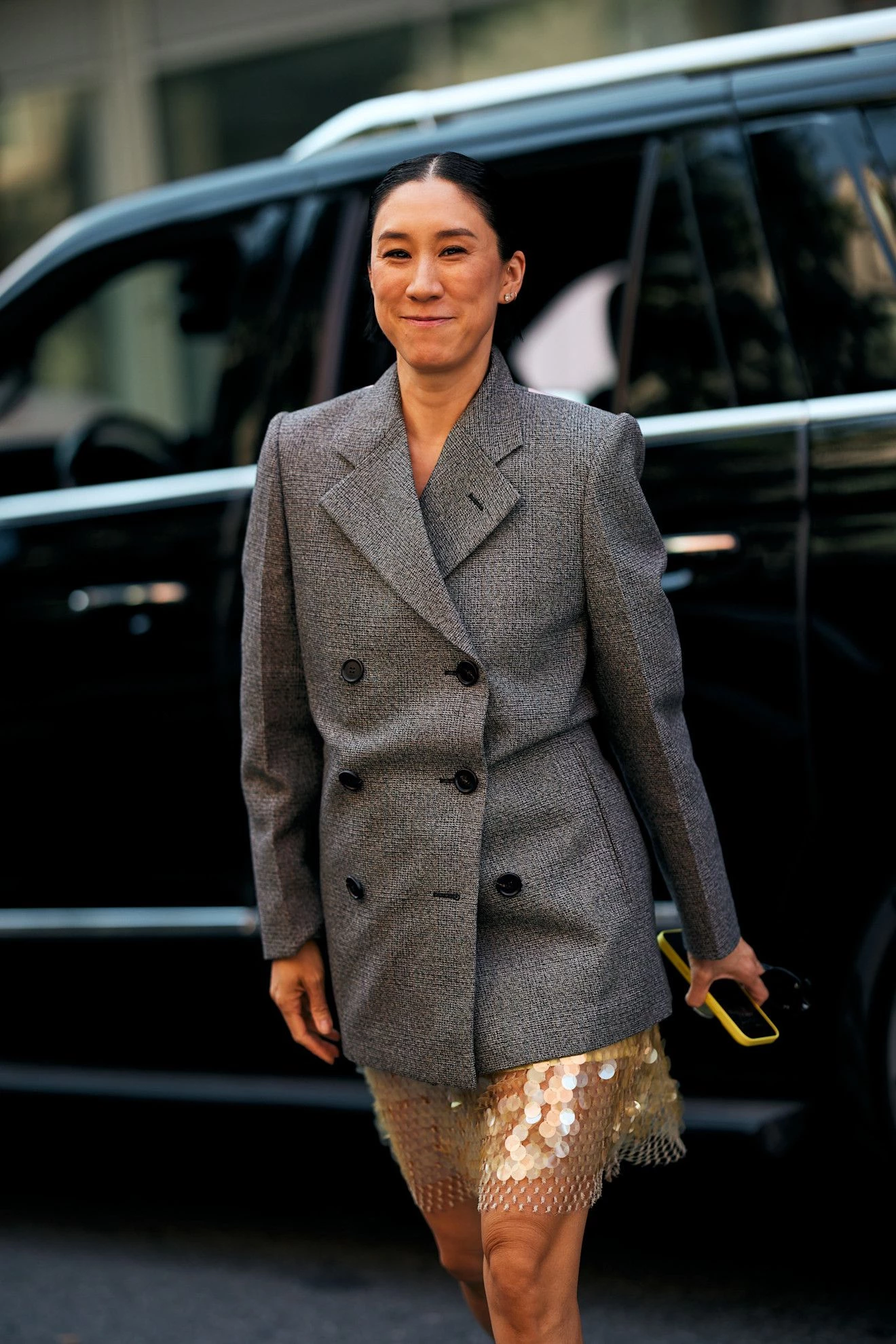 During the occurrences of New York Fashion Week, Eva Chen demonstrated the feasibility of donning a sequined skirt even in the realm of the professional milieu. She correlated the micro-skirt embellished with sequins to a buttoned-up gray blazer and radiant ballet flats. The overall impression appeared subdued, elegant, and decidedly contemporary concurrently. This constitutes an additional validation, reinforcing the idea that an evening skirt fulfills its potential remarkably within the context of daily existence.