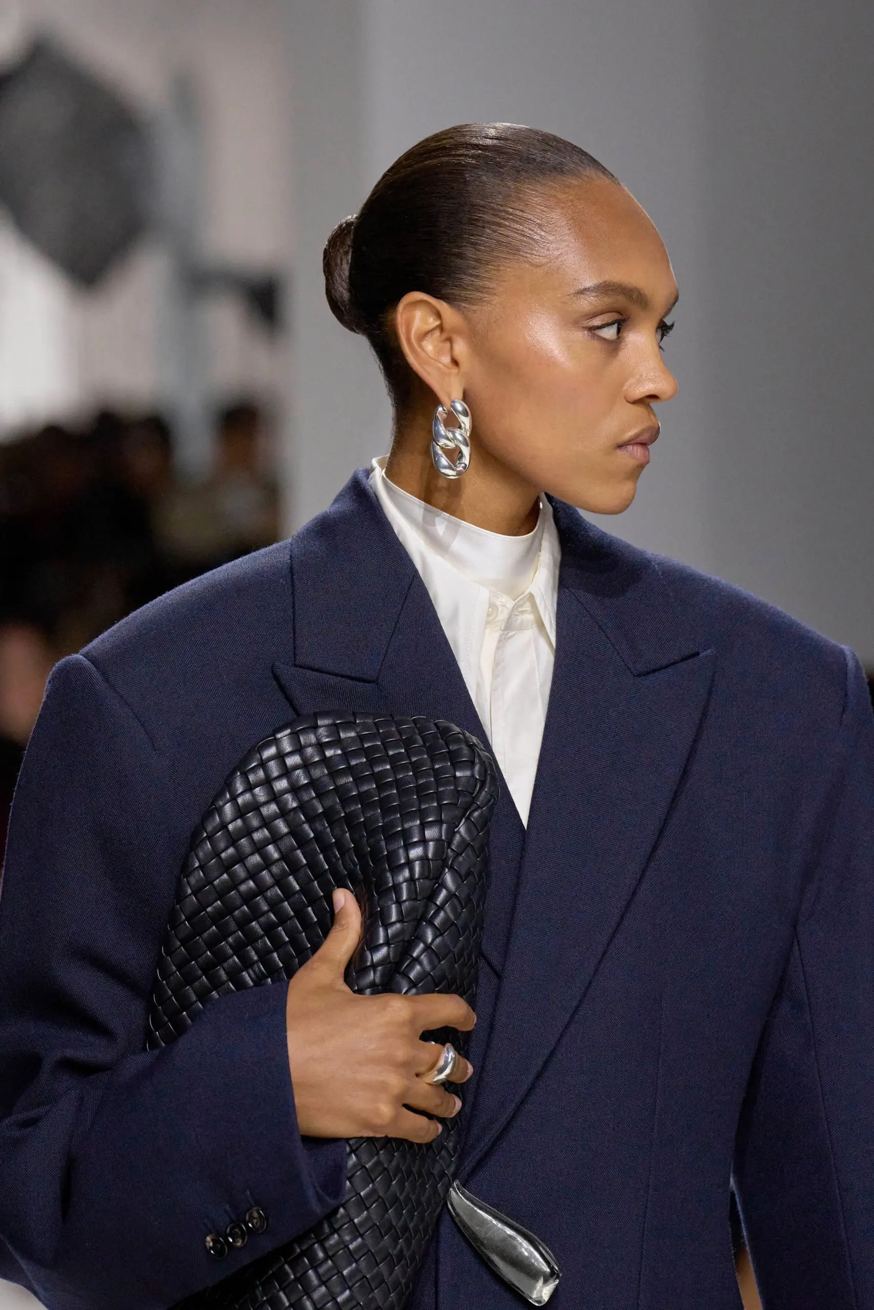 Coordinating sets featuring formal jackets and loose-fitting pants stand out as dominant outlines of the season. The distinct and exact tailoring of the coats opposed the softened silhouette of the trousers in the Bottega Veneta collection. This reflects unadulterated sophistication.