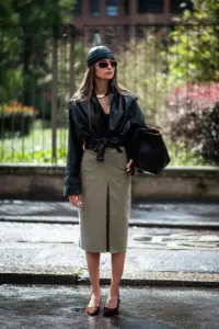 A true sensation this season is a suede pencil skirt reaching the knees, paired with a matching jacket, contrasting hosiery and footwear with short heels. Alternatively, consider a flared silhouette in a pleated manner, enhanced with caramel-colored heeled boots and a Nike athletic jacket. This is how Bella Hadid styles it, taking cues from the Wild West’s charm and audaciously intermixing diverse styles.