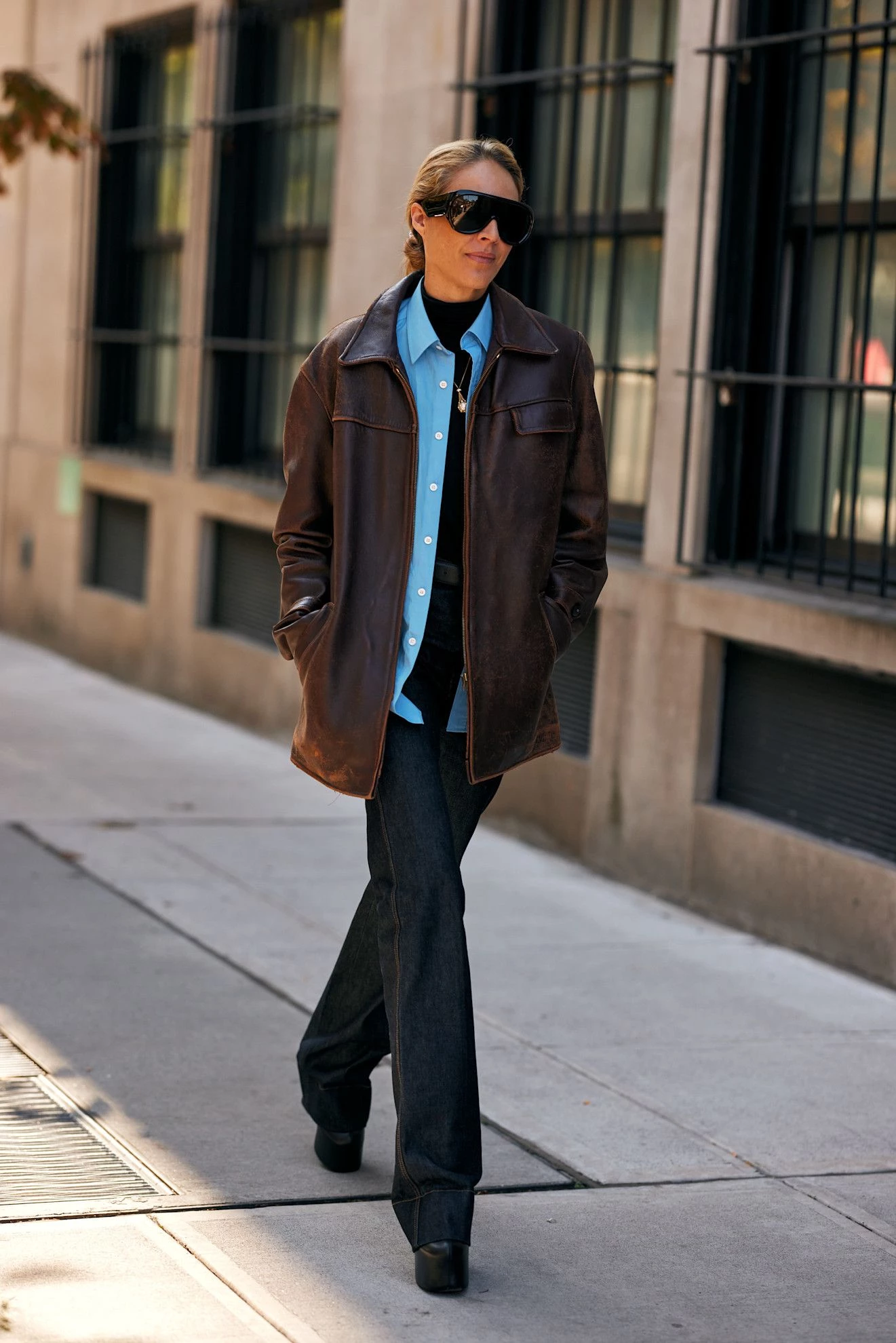 A standout pairing from the fashion month. A light blue shade tempers the intensity of rich chocolate. Just a single element — perhaps a blouse or pullover — is sufficient to lighten a warm-toned monochrome ensemble.