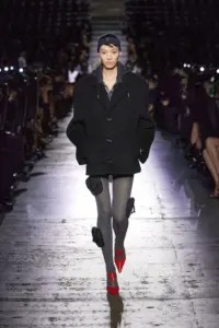 Following on the runway was Kendall Jenner, donned in the very attire Nicole Kidman sported in the 2001 motion picture Moulin Rouge. The model was celebrated with cheers from Aurora James, Da’Vine Joy Randolph, and esteemed costume creator Ruth Carter, who were seated in the front row.