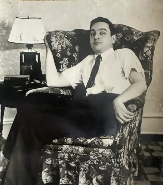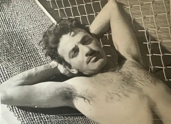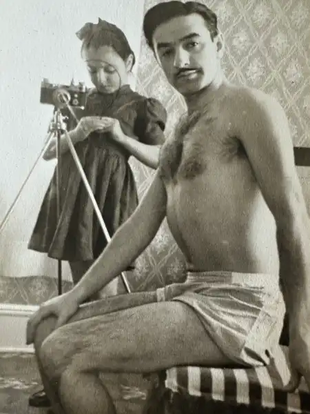 By the nineteen-forties, when he was in his thirties, Eli was evidently more self-assured in his appearance. In snapshots from this time frame, his slender build has broadened, his hair is slicked back, and his mustache resembles the thin, Clark Gable style. The humorous expressions of his early selfies have disappeared. He’s posing in a dreamy manner, shirtless, in a hammock. He’s projecting an elegant image in a peak-lapel suit complemented by a boutonnière. He’s resting an elbow atop a low wall, presenting himself in an “about the author” pose. Occasionally, he employs both the shutter-release cable and a mirror—you can deduce this because, while clutching the cord, he also directs his gaze slightly to the side, to examine his reflection.