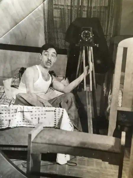 For Eli Fuchs, the selfie offered no such immediacy or viewership. The actual procedure entailed an immense amount of effort. In his initial endeavors, you can discern that he employed a mirror to capture his reflection, and he undoubtedly meticulously planned his attempts in accordance with the available light. Afterward, he had to process his film. My mother, presently ninety, recalls that, despite the cramped quarters at home, “he maintained a darkroom equipped with trays containing diverse types of solutions. Subsequently, there was an entire drying setup, with the prints suspended on a line.”