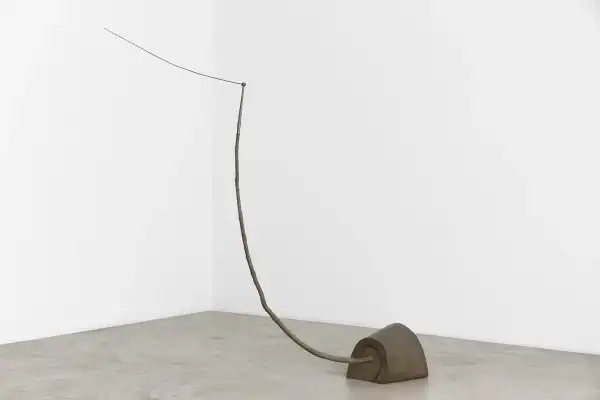 This, admittedly, embodies the crux. Puryear refrains from being a dogmatic artist. The remarkable facet concerning his art transcends what it conveys; it concerns the manner in which it can assemble your consideration within a singular locus and reroute it elsewhere. It would prove inequitable to assert nothing precisely mirrors its outward guise, yet precise to declare that nothing solely embodies its outward semblance. One of the most captivating recent works featured within “Nexus” encompasses “The Way” (2022). Emanating from a stunted block shaped after a roofed wagon bereft of its casters, an extended sapling arcs approximately eight feet upwards into the atmosphere to furnish a perch for a slender rod directing forward (or conceivably backward, lacking a means of ascertainment). The inaugural rendition of the composition was conceived, akin to “Sanctuary,” from a scarecrow-esque assortment of constituents: a maple sapling, a willow sprig, a base of pine and curly maple. This entity, contrarily, exists as a bronze casting, bestowing its whimsical choreography with solemnity. Sticks and rocks may enact their inclinations, yet bronze partakes in the affairs of monuments. It conveys tidings to bygone and current eras, murmuring profound matters.